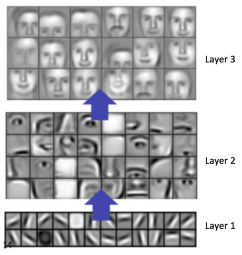 From your life experience, you know that a cat typically has sharp ears, round eyes, a triangular nose, and facial hair. The machine wants to figure out important information like that too! At a very high level, the way that image recognition works is that the computer will analyze the image in multiple steps. First, it tries to identify very simple aspects of the images: lines, edges, corners, blobs, etc. Using that information, we build up into slightly, just slightly more complex shapes: squares, circles, triangles. After a few iterations, it starts to recognize high-level features such as eyes, nose, mouth, etc. Finally, by putting all the pieces together, it computes a probability score for this image for each class of objects it could belong to (e.g., cat, dog, bird, etc). As we’ll see later, a layer of connected neurons is responsible for each of those steps and all those layers combine to form a convolutional neural network. A visualization looks something like:
