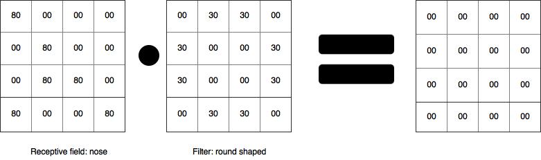 In deep learning, this “reference object” is called a filter (also referred to as kernel), and the part of the image that is being compared to is called a receptive field. The amount by which the filter and the receptive field overlap is computed by doing an element-wise multiplication and then summation (dot product). The amount by which the window moves is called a stride. In the above illustration, the filter is of size 4×4 with stride 1. For each position of the filter, it computes a dot product between the filter and the receptive field to compute how much they overlap. For example, if I have a filter that tries to identify round shapes, then my filter might look like this: