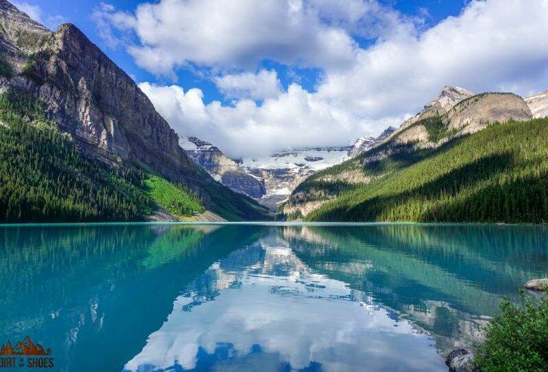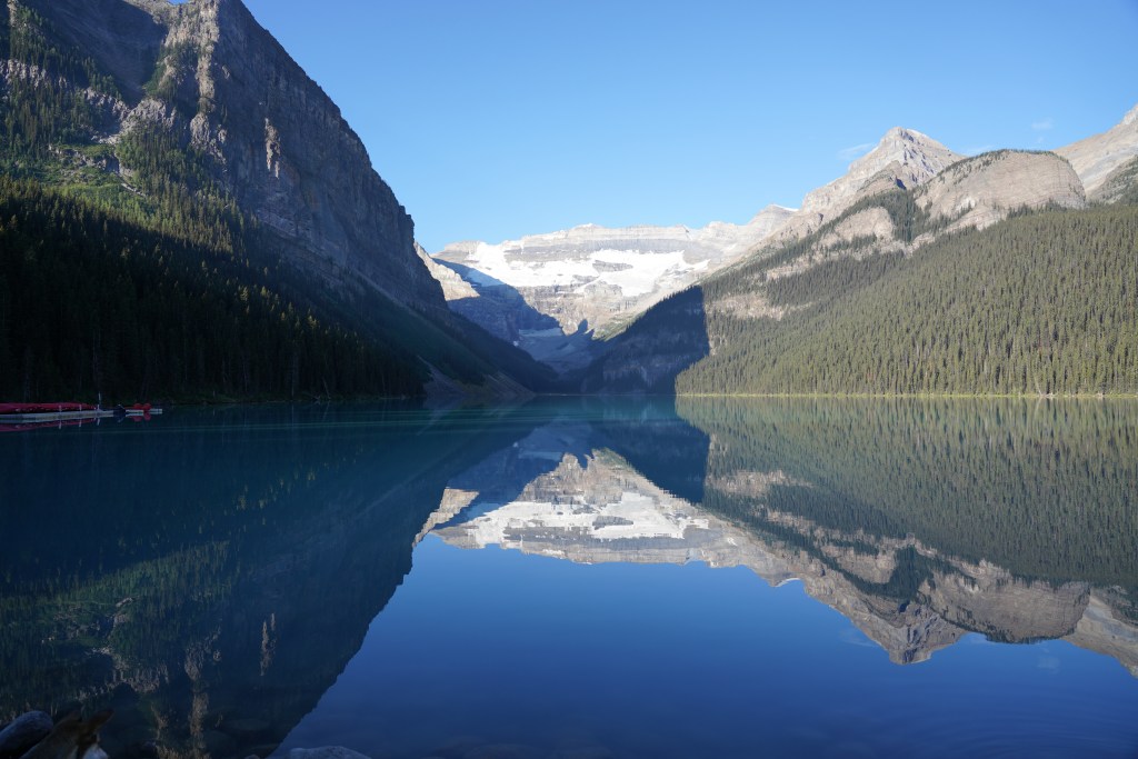 一个美丽的班芙一般需要符合以下几个要求:阳光明媚,能见度高,顺光,湖水静谧有山的倒影。这就要求了首先不能是阴天,不能有雾霾,不能有风,因为风会使湖面掀起涟漪,湖面则无法像镜子一样呈现山的倒影。