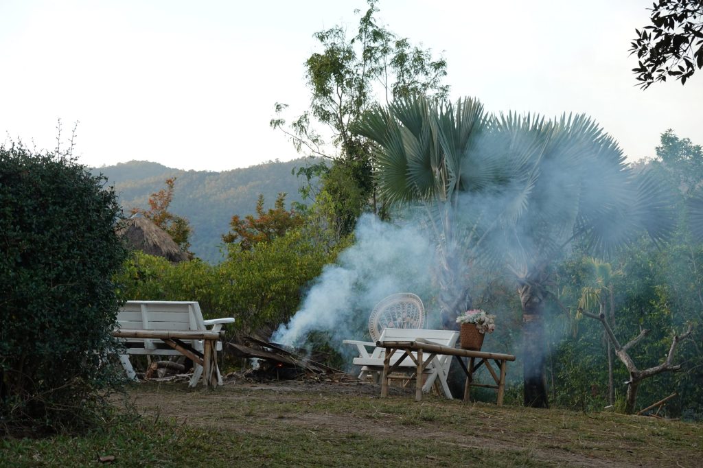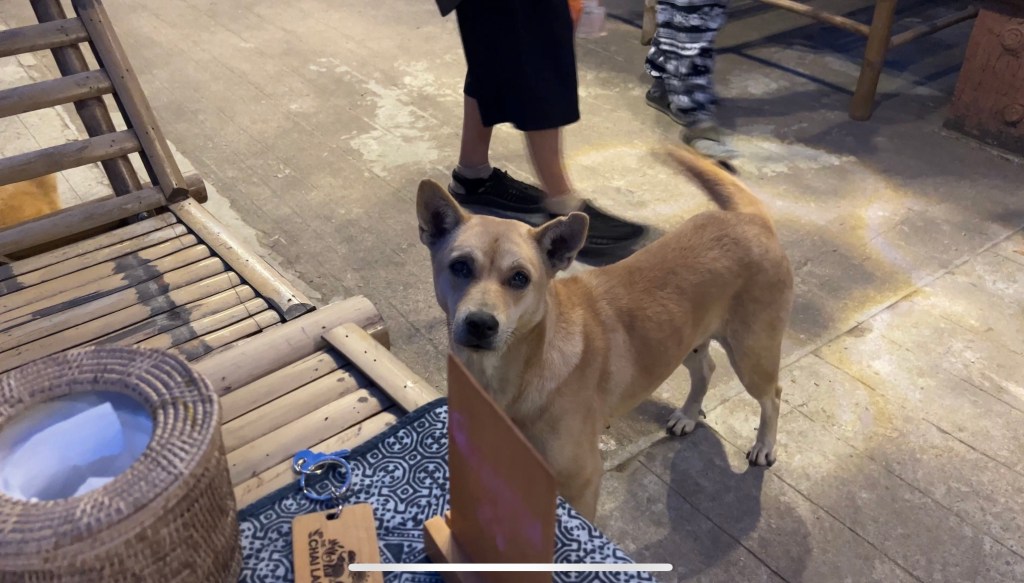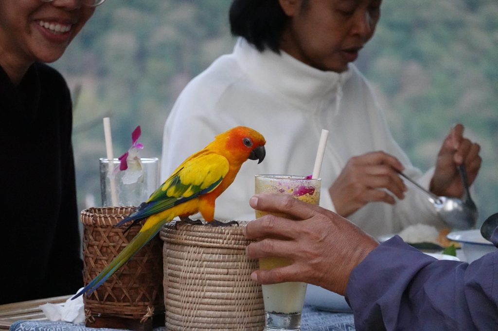 🍽 吃饭:特别香!!!农村做饭就是香啊,正宗的泰式食物,而且吃饭的氛围特别好,旁边就是山景,篝火,还有很多小动物跑来跑去的,甚至还有鹦鹉抢你的果汁,小狗狗在桌子旁边摇着尾巴求吃的。音乐,string lights, 整个就很浪漫