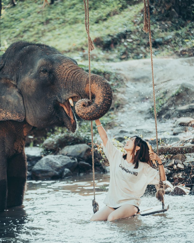 上午会有一个guide过来带着你跟大象玩。这些guide是从附近的Karen Village来(跟大家熟知的长颈族是同一个部落,但是不同的分支,这个分支是不用🦒的),我们会被分配到一头大象,会有一个象夫在旁边,这些象夫需要经过3年的学习才能毕业。他们会教我们一些简单的象语,神奇的是,这些象语是通用的!也就是说,大象不需要经过人的训练就自然会听得懂这些语言,当然这仅限于亚洲象。如果是非洲象的话,就需要学习另一个语言(就连人的语言都不相通呢)之后就是给他们喂食,给他们洗澡。Guide非常乐意帮我们拍照,给我们拍了无数张😂 注意脚下,可能会收到来自大象的礼物💩