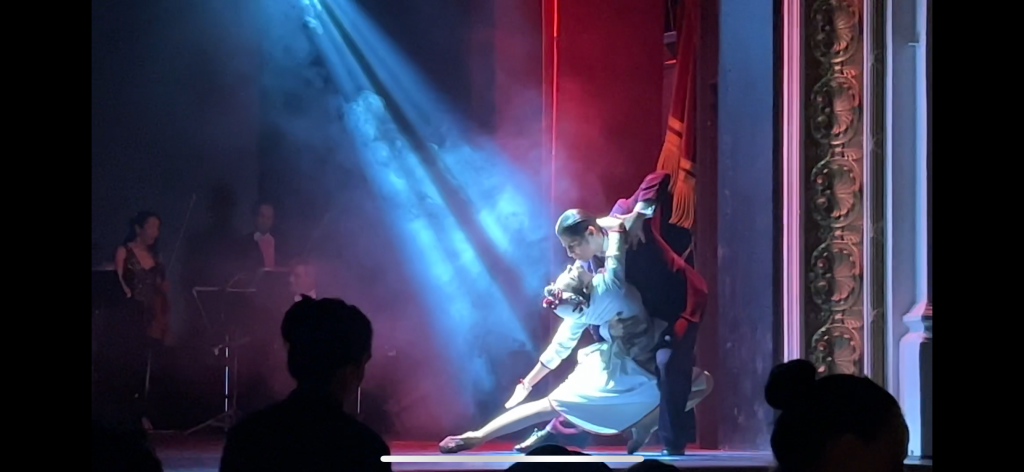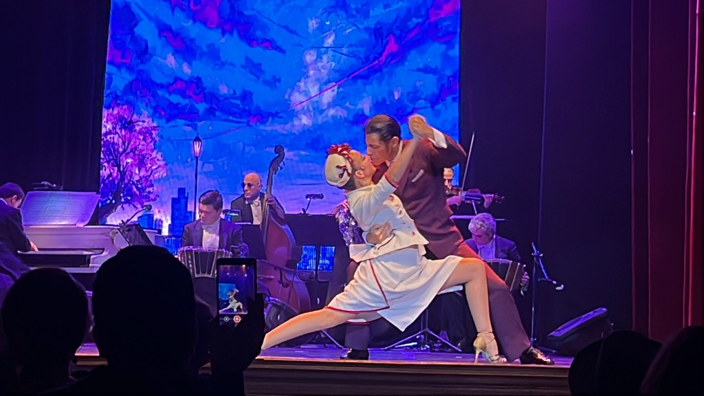 烤肉虽好吃,但有时肚子饿的时候确实令人绝望,因为几乎所有的餐馆都要晚上8点以后开门。时常饿到饥肠辘辘,甚至都想吃顿麦当劳解决算了。虽然在布宜待了两个星期,但依然无法适应这样的节奏。在阿根廷,时间和金钱是最不值钱的东西。有时甚至觉得社会这台机器停滞不前了,好像所有的人都停下来了。这让我瞬间都觉得巴黎的餐厅要晚上7点后才开门都算勤快的了。娱乐活动当然也是要9点、10点以后开始。我们慕名去Teatro Piazzolla看了场探戈秀,这家剧院是先有免费的class让你接触一点点探戈,然后包的3 course dinner,然后吃饱喝足了(10点)开始看秀的。这场秀涵盖了不同时期的探戈风格,有现场的乐队(一个钢琴,两个民族风琴,一个小提琴,一个大提琴)和大屏幕。从最古典的开始,衣着明显保守,穿的都是宫廷风,舞步更类似于交际舞。随着时间往前进,还有个类似像ninja一样的时代,后面则越来越开放大胆,穿着上会出现破洞丝袜和光膀子的猛男,舞步速度也越来越快,越来越欲,有很多互相踢进对方裆位的动作。再到后来,动作越来越复杂,就开始有点像杂技了。有很多把女生在地上拖几圈的动作,还有很多高难度转来转去的动作。每个时期的表演都结合着屏幕的画面和现场表演的音乐,非常融洽。